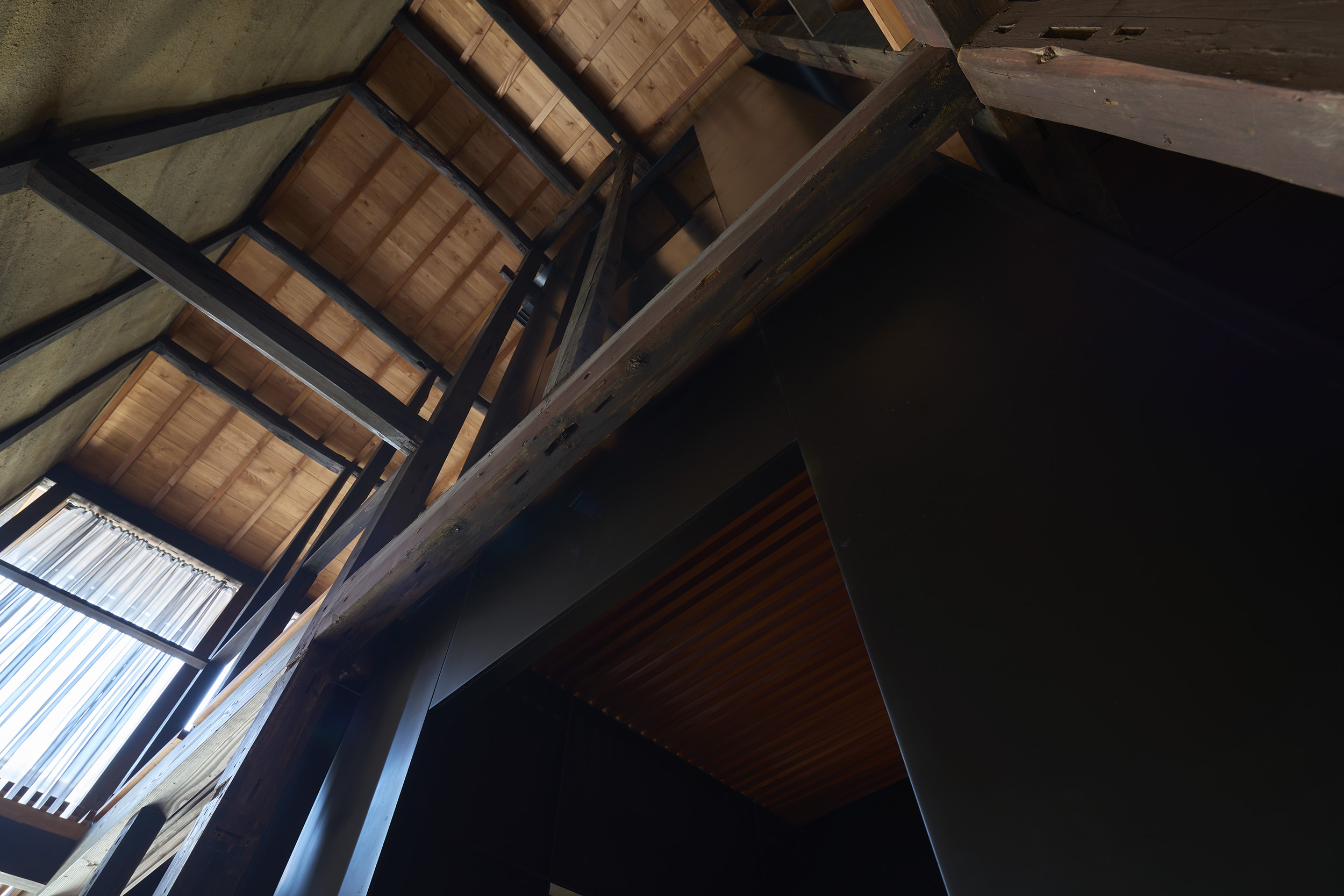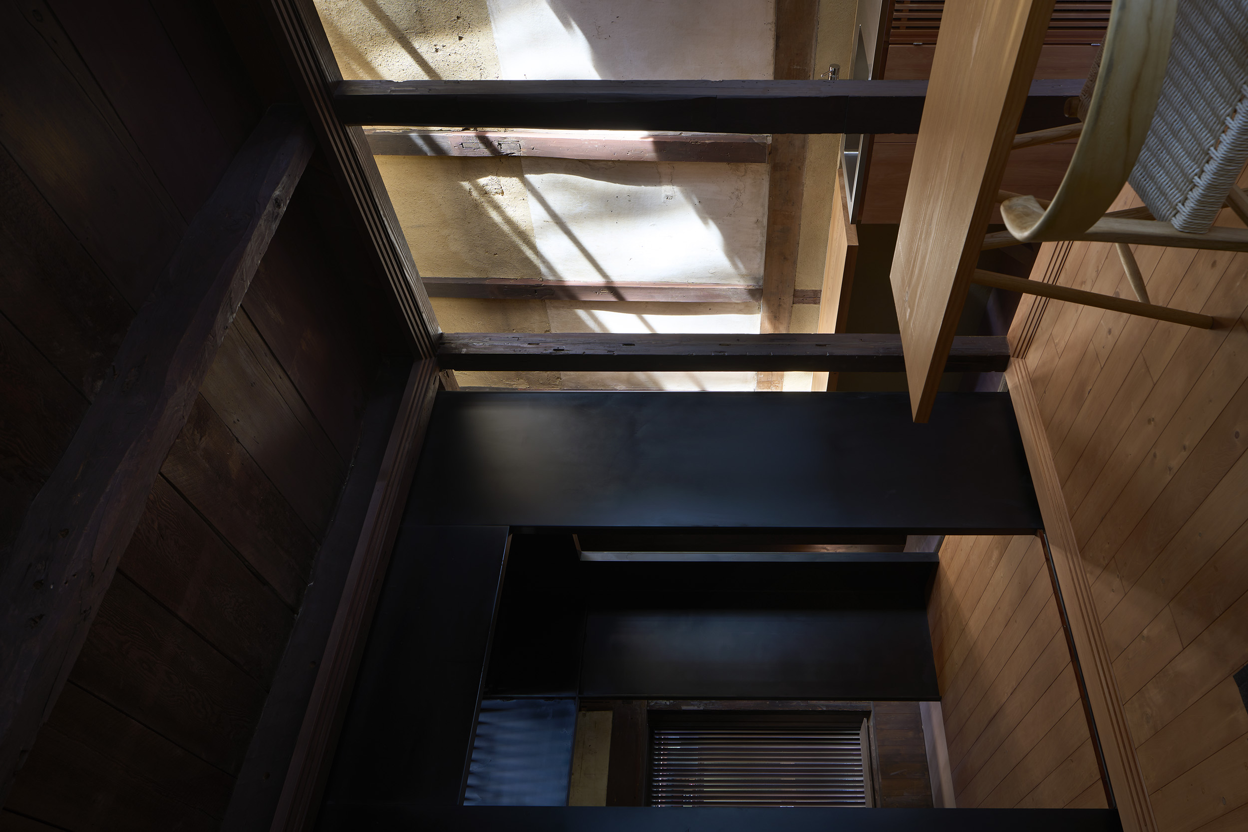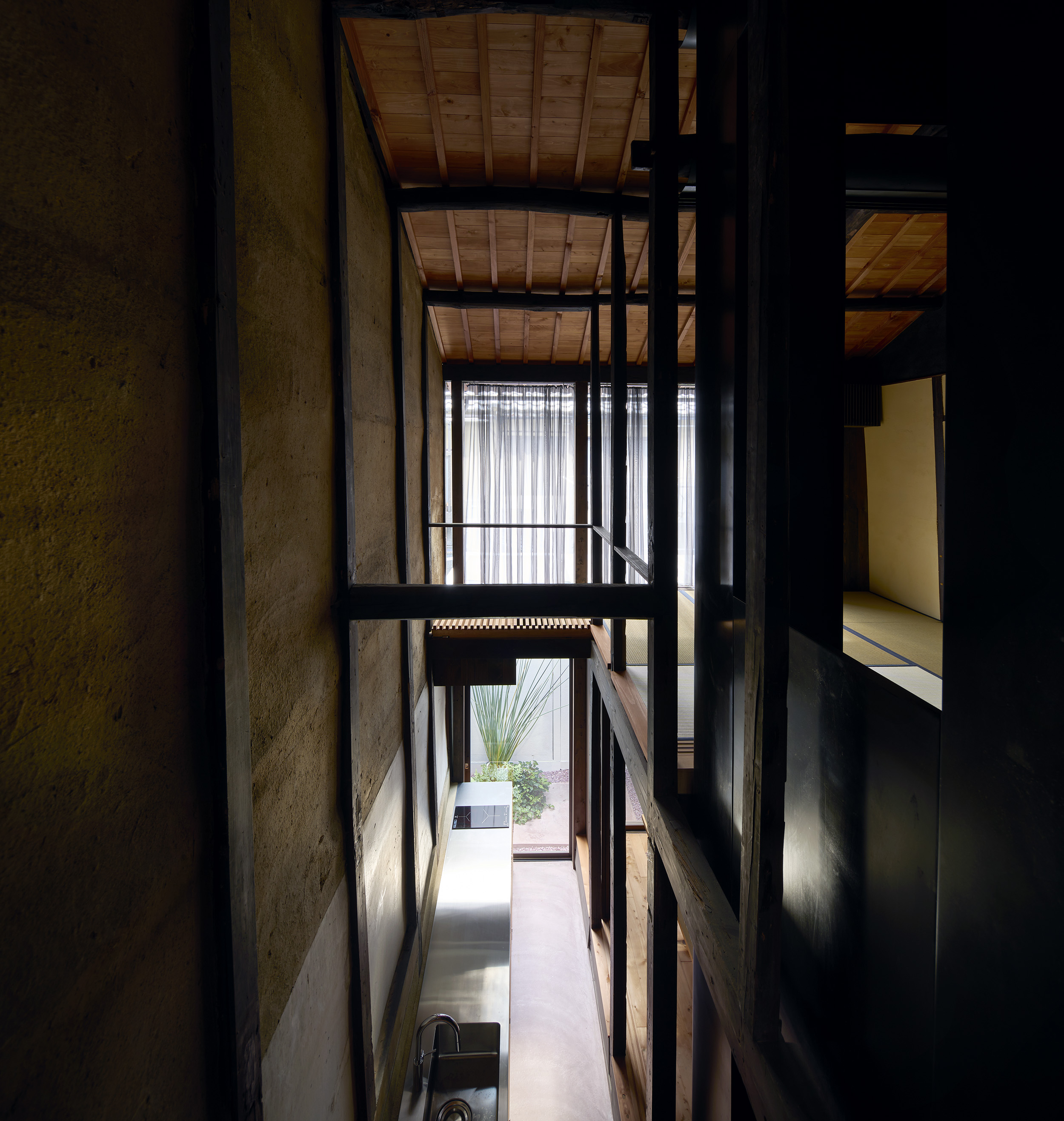 土間から見上げる。町家を未来に継承するために、町家の間取りを継承しつつ、3棟すべての地震力を受けられるよう2畳分の広さの鉄板コアを設けた。