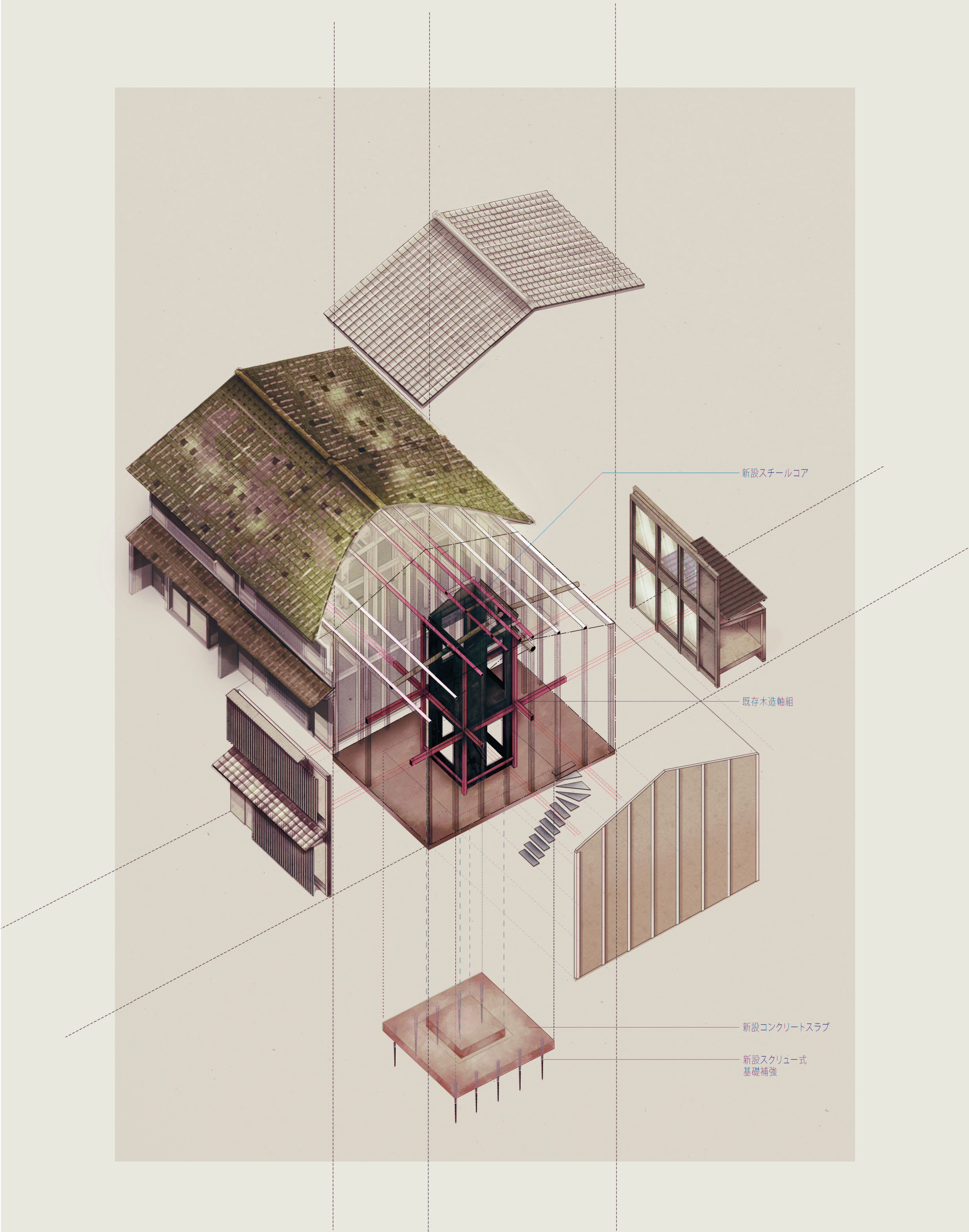 鉄板コア回りの構造図。母屋に鉄板を沿わせ、屋根の落下防止にも寄与させている。
