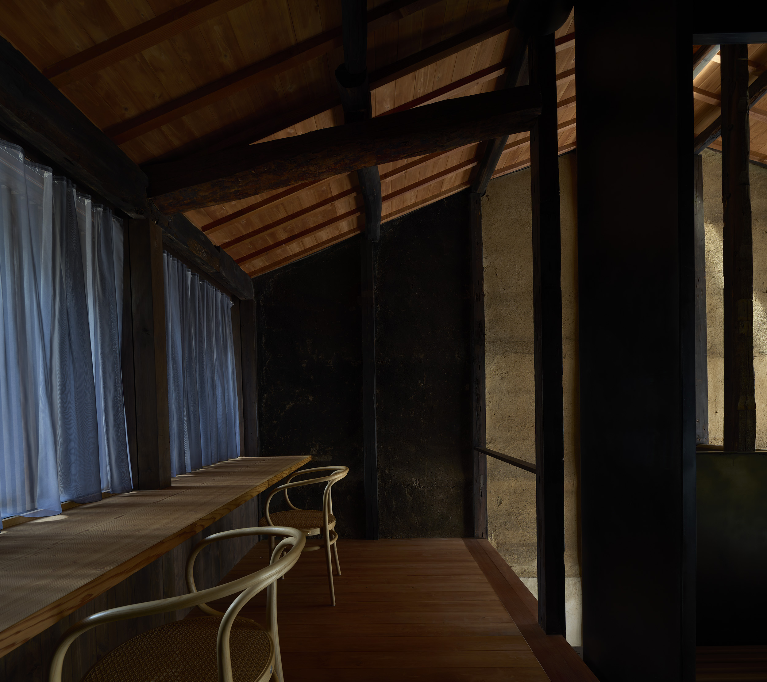 通り庭の天井高は約5,240~6.500㎜。正面のスノコ状の床は新たに設けた。劣化の著しかった一部の一階柱脚部は金輪継ぎにより補修。また柱は約10㎝の傾きがあったため立て直した。母屋は既存のまま、垂木間を新設の板張り天井とした。