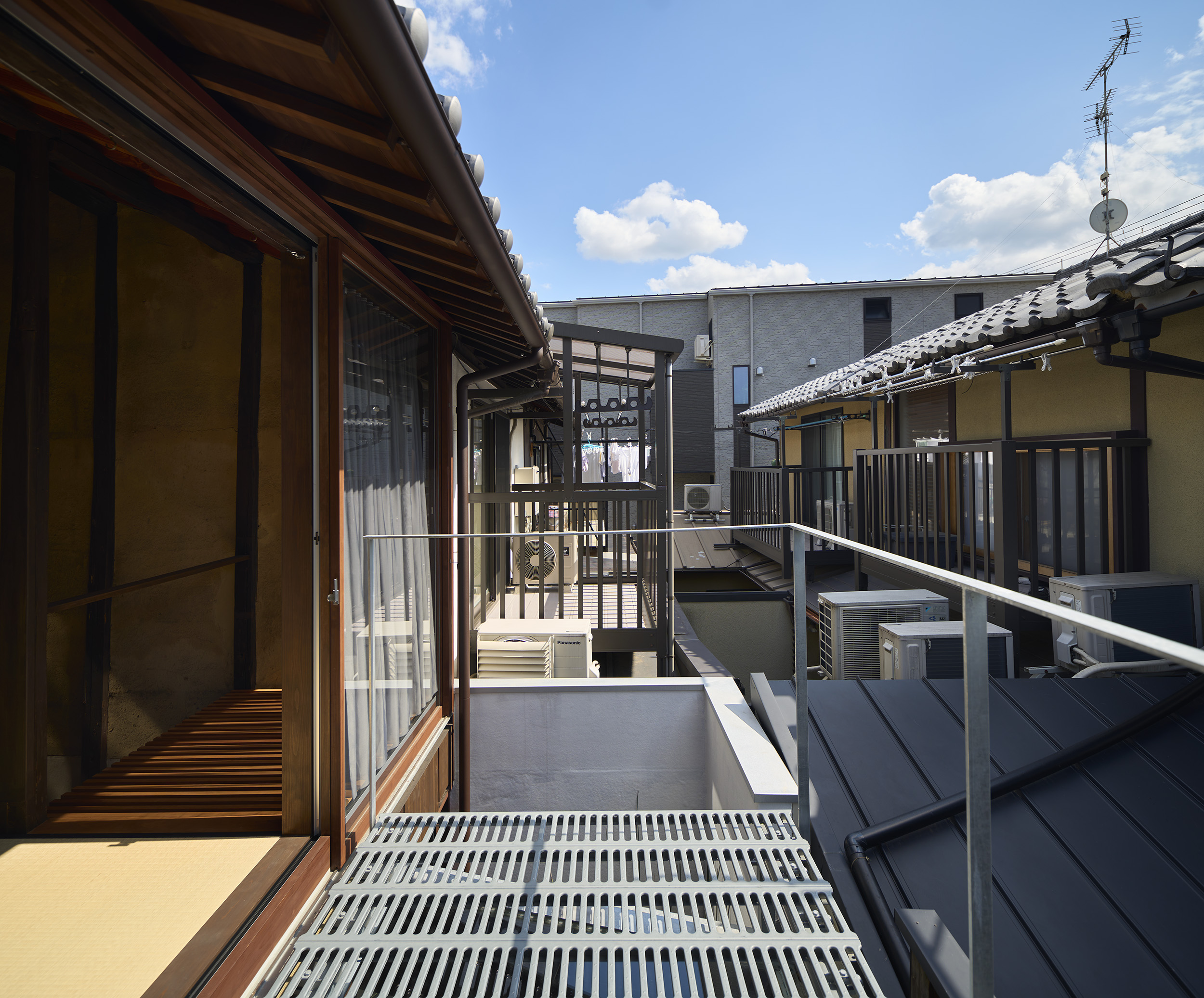 路地に面した2階板間。縦格子で視線を遮りつつ、中にもカーテンを設けることでプライバシーを確保。