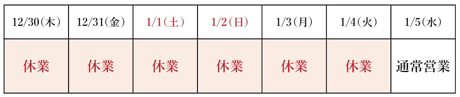 年末年始のお知らせ 2021.12.21| お知らせ, ブログ 平素より当社をご愛顧いただき、ありがとうございます。誠に勝手ながら、年末年始の下記期間は、お休みとさせていただきます。 1/5(水)より通常営業となります。ご不便をおかけしますが、何卒宜しくお願い致します。